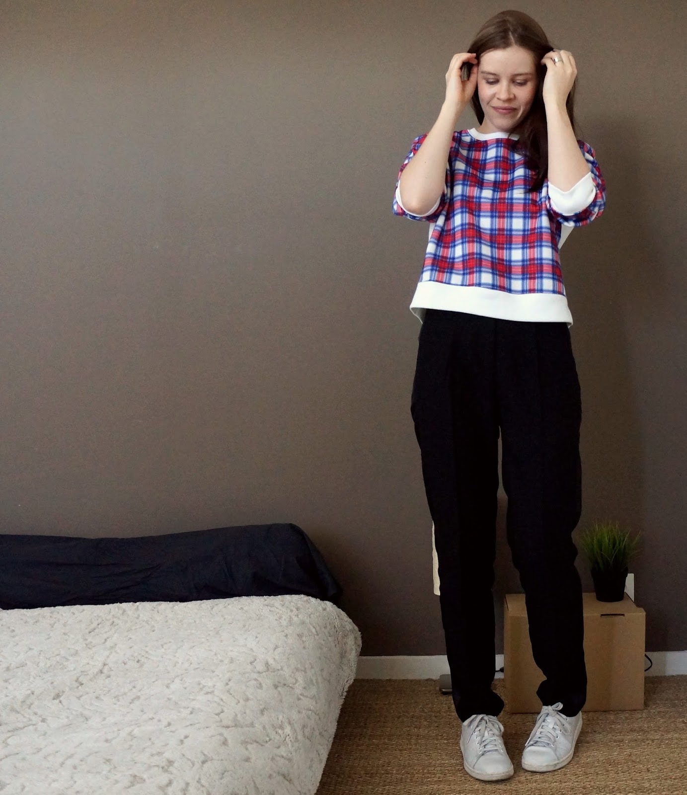 Après les rayures, voilà que je vous sors un look avec des carreaux ! Décidément, je suis vraiment revenue aux motifs ! Encore un look tout en contradictions, avec ce super sweat déniché chez Topshop en soldes (youpi !) et mon pantalon de smoking H&M, que vous avez déjà vu dans mon dernier article. Je persiste et signe avec l'association smoking-baskets, qui crée un parfait décalage, accentué ici par le sweat, décontracté mais malgré tout assez chic, grâce à son motif à carreaux. Une parfaite équation, en somme (faut que j'arrête avec mes théorèmes fashion, moi...).