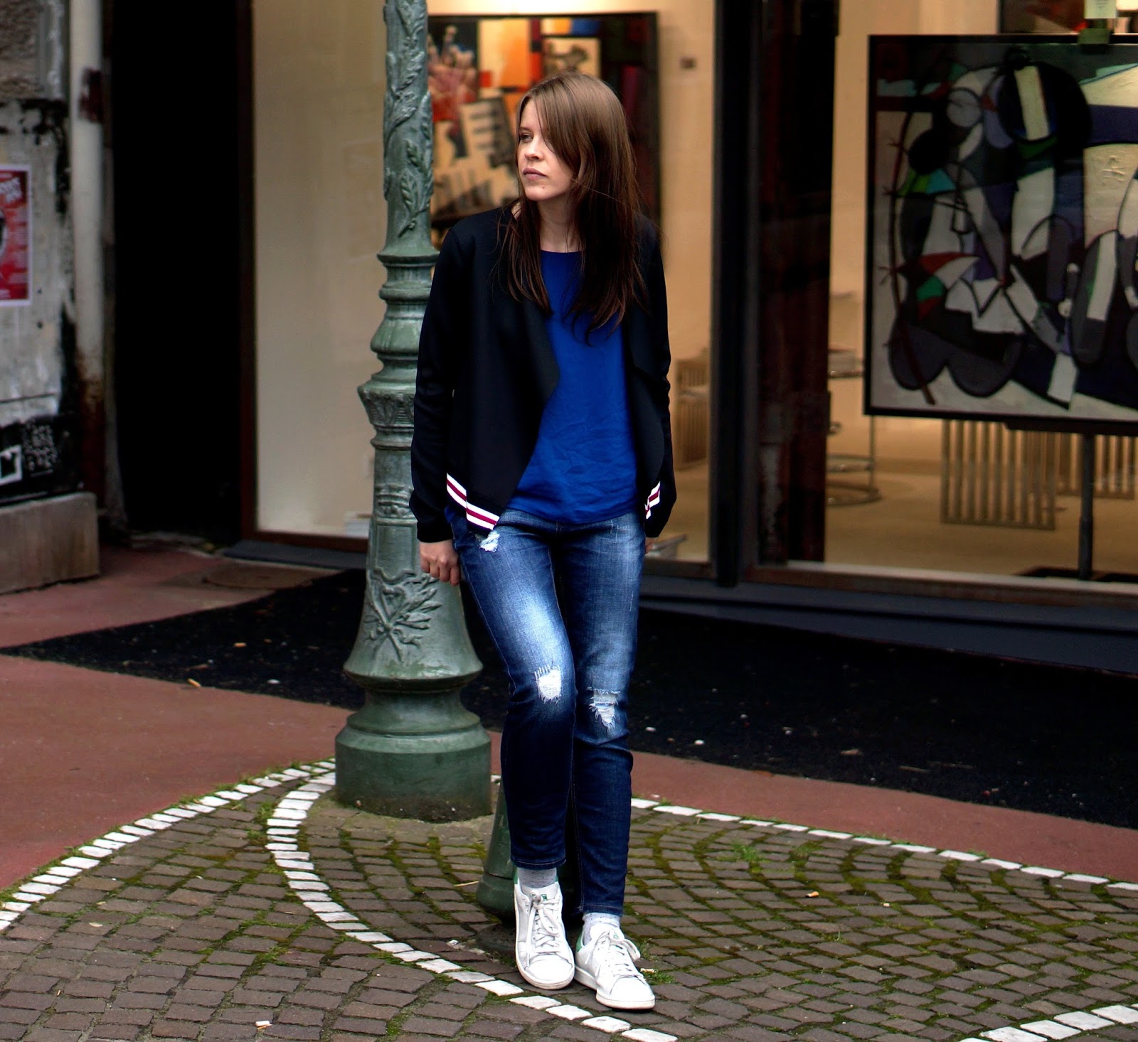Sport chic, une de ces expressions à la mode qu'on utilise un peu à tort et à travers, mais qui décrit quand même très bien cette petite veste absolument parfaite dénichée en soldes chez Zara. Avec sa coupe blazer revisitée, sa matière effet néoprène et ses bordures côtelées à rayures, elle est tout à fait dans cet esprit : à la fois classe et décontractée, chic et sportive, donc. Tout ce que j'adore, en fait. Et le reste de ma tenue est au diapason : un petit top Mango élégant (trouvé en soldes également), porté avec un jean déchiré et des baskets. Encore une fois, tout est une question d'équilibre ! Je sais, je me répète, je dis un peu toujours la même chose à propos de mes looks (ouaaaais, change de disque, un peu), mais je pense que c'est vraiment ça qui définit « mon style » (pour autant que j'en aie un) - et ma personnalité aussi, d'ailleurs : l'ambivalence, le mariage des opposés.