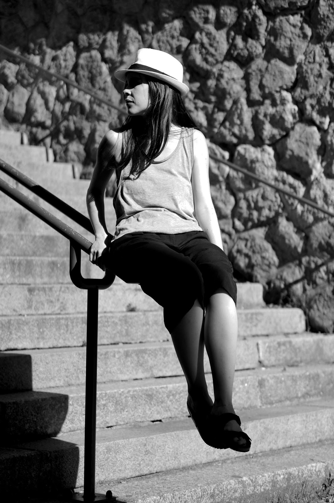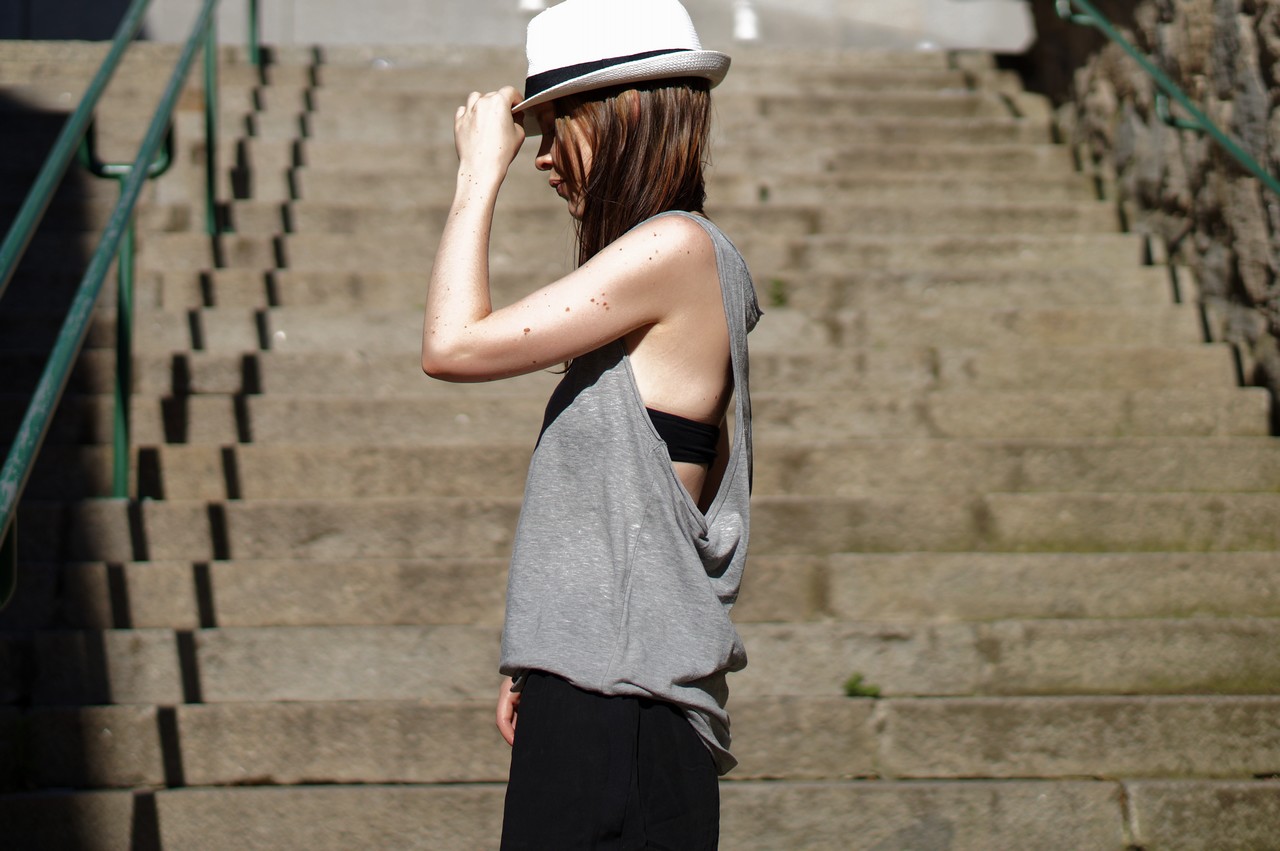 Un débardeur (très) échancré, un chapeau (oui, encore !) et des sandales (oui, encore ! bis)... Quel meilleur uniforme pour bien commencer l'été ? Une fois de plus, je suis partie dans le super loose en haut comme en bas. Mais, comme pour la dernière fois, le haut dévoile un peu de peau et apporte une petite touche « sexy », ce qui permet d'échapper au look sac à patates (ouf).